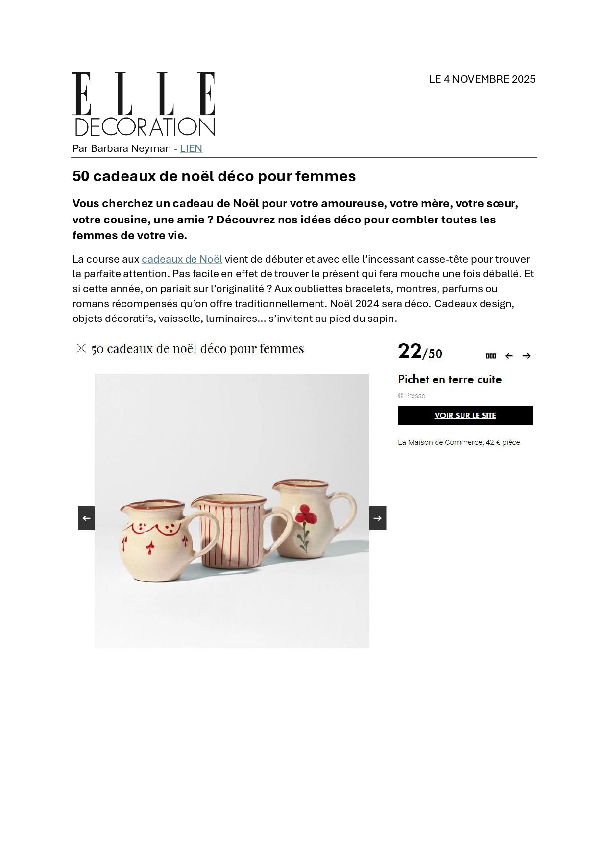 Accueil / Presse / ELLE DÉCORATION 21 mars, 2024 ELLE DÉCORATION Novembre 2025 Décembre 2024 - Hors série Décembre 2024 Juillet - Août 2024 Juin 2024 Mai 2024 Avril 2024 Mai 2023 Mai 2022 Décembre 2019 Partager Partager sur Facebook Épingler Épingler sur Pinterest