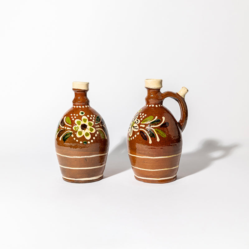 Très beaux pichets traditionnels Roumain en terre vernissée ornées de fleurs.