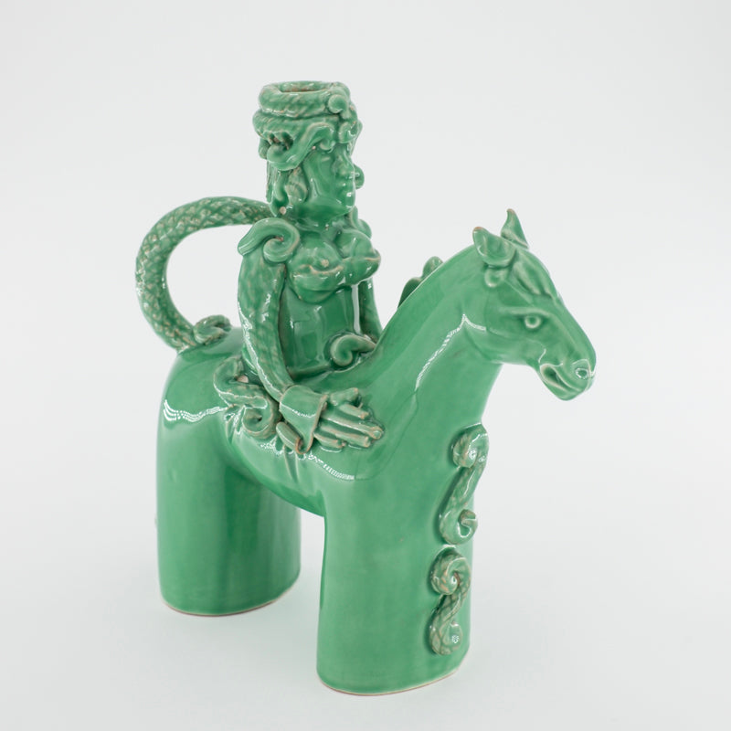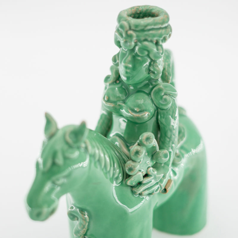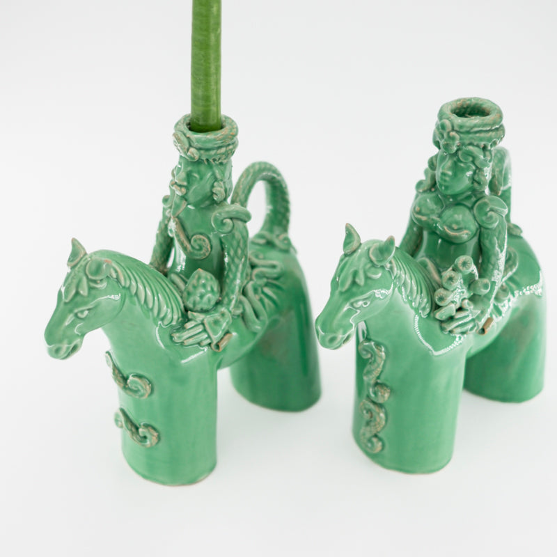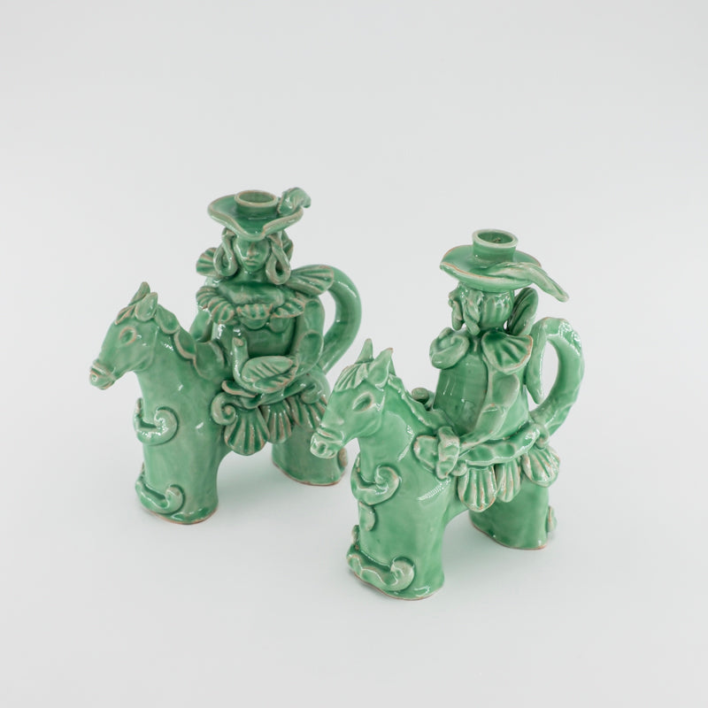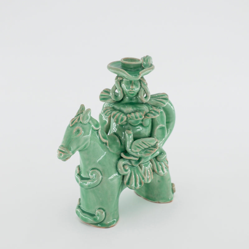 The horseman candlesticks pay homage to a feudal tradition in Puglia: aristocrats illuminated their homes with these ceramic knights, custom-made to adorn their banquet tables. Sculpted and hand-painted in Grottaglie, each knight is unique in shape, color, and motif, reflecting the refinement and prestige of this centuries-old practice. The models are available in small and medium sizes, in masculine and feminine versions.