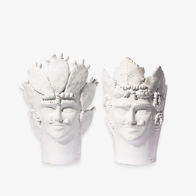 Entièrement émaillé de blanc, ce cache-pot en forme de tête sicilienne coiffée de feuilles de vigne évoque à la fois la sculpture antique et l’objet du quotidien. À la fois cache-pot, vase ou simple objet décoratif, il trouve naturellement sa place sur une étagère, une table basse ou un rebord de fenêtre. Sa présence est à la fois forte et apaisante, apportant à l’intérieur une touche méditerranéenne, élégante et intemporelle.